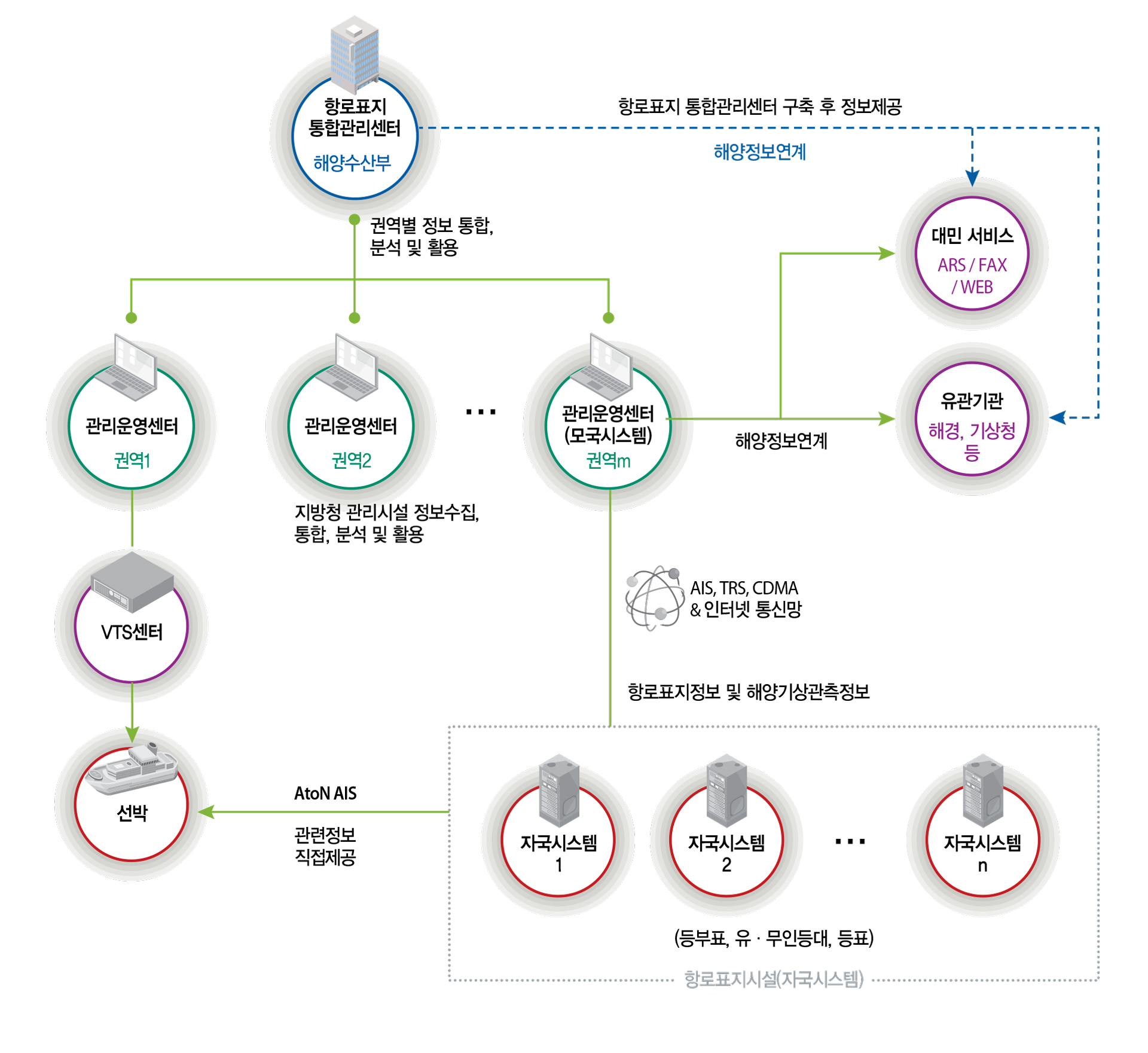 항로표지의 상태 정보는 AIS(VHF), WCDMA 및 인터넷 통신망을 이용하여 원격지의 관리운영센터에 전송되며, 수신된 상태정보는 데이터베이스에 저장되어 운영된다.