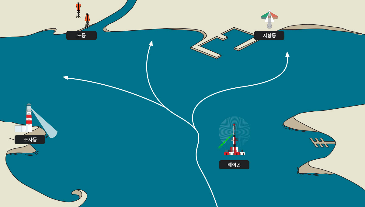 기타항로표지 지향등 (Sector light) 항로 연장선상의 육상 지점에 단독으로 설치하는 구조물로서 하나의 등기구에서 3색광이 투사되며 항해자는 중앙의 백색광을 따라 진입하여야 한다.